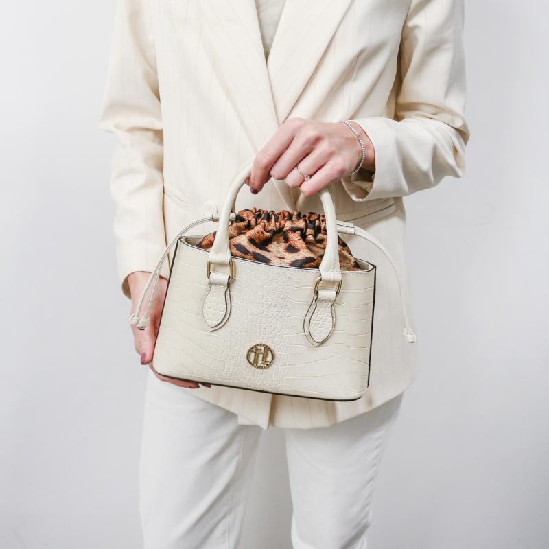 Το μοναδικό της άνοιγμα διαθέτει animal print πουγκί με δερμάτινα κορδονάκια, προσδίδοντας μια τολμηρή και πολυτελή πινελιά. Το ενιαίο εσωτερικό είναι επενδυμένο με φόδρα με το λογότυπο της εταιρείας και διαθέτει μία εσωτερική τσέπη με φερμουάρ και μία ανοιχτή θήκη για εύκολη οργάνωση.