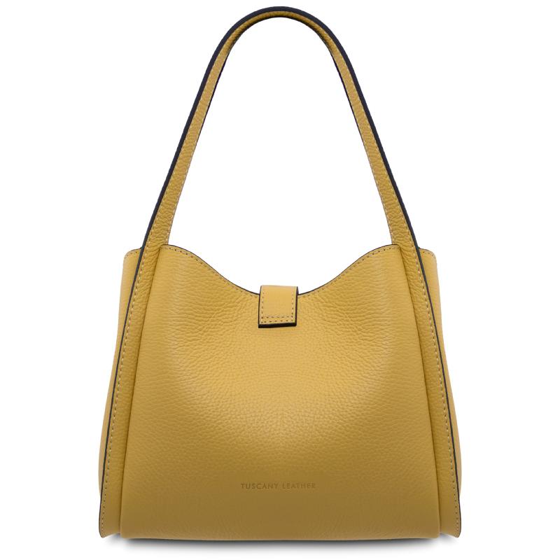 Η γυναικεία τσάντα Soave είναι μεσαίου μεγέθους, κατασκευασμένη από εξαιρετικής ποιότητας μαλακό ιταλικό δέρμα pebbled και είναι ημιάκαμπτης κατασκευής. Η πρόσβαση στο εσωτερικό της τσάντας γίνεται με μεταλλική twist κλειδαριά 2 θέσεων. Το εσωτερικό διαθέτει τρία διαμερίσματα, με το διαχωριστικό των οποίων, να αποτελεί μια μεγάλη θήκη με φερμουάρ. Εντός της υπάρχει μια ακόμα μικρότερη τσέπη με φερμουάρ.