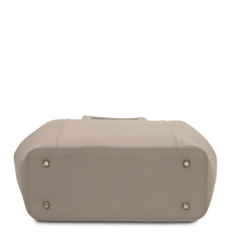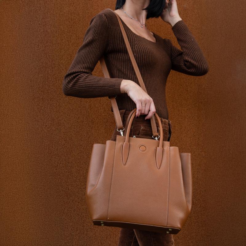 Η τσάντα Tulipan διαθέτει μεγάλες δερμάτινες λαβές ύψους 12,5 εκ. για άνετο κράτημα, ενώ συνοδεύεται από αποσπώμενο λουράκι ώμου με μέγιστο μήκος 120 εκ., για να φορεθεί κρεμαστή στον ώμο. Στο κάτω μέρος της τσάντας, θα βρείτε μεταλλικά ποδαράκια που προστατεύουν το δέρμα από φθορές και παρέχουν σταθερότητα όταν την ακουμπάτε σε επιφάνειες.