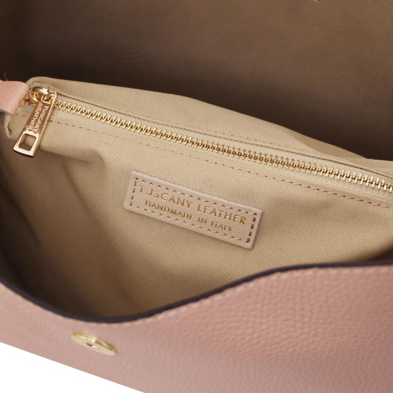 Η γυναικεία τσάντα Clio είναι μεσαίου μεγέθους, κατασκευασμένη από εξαιρετικής ποιότητας μαλακό ιταλικό δέρμα Hammered και είναι ημιάκαμπτης κατασκευής. Η πρόσβαση στο εσωτερικό της τσάντας γίνεται με μαγνητικό button ακριβείας. Το εσωτερικό διαθέτει δύο διαμερίσματα, με το διαχωριστικό των οποίων, να αποτελεί μια μεγάλη θήκη με φερμουάρ.