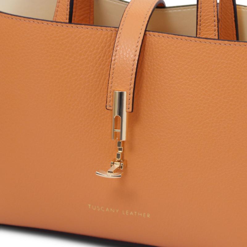 Είναι εξοπλισμένη με σταθερές δερμάτινες χειρολαβές ύψους 10cm και αποσπώμενο, ρυθμιζόμενο λουράκι ώμου μήκους 62-117cm, προσφέροντάς σας πολλαπλούς τρόπους μεταφοράς. Στη βάση της τσάντας υπάρχουν μεταλλικά προστατευτικά ποδαράκια, ενώ όλα τα μεταλλικά στοιχεία είναι σε κομψό χρυσό φινίρισμα.