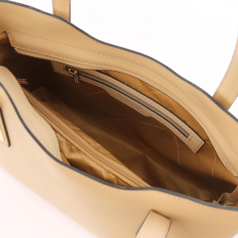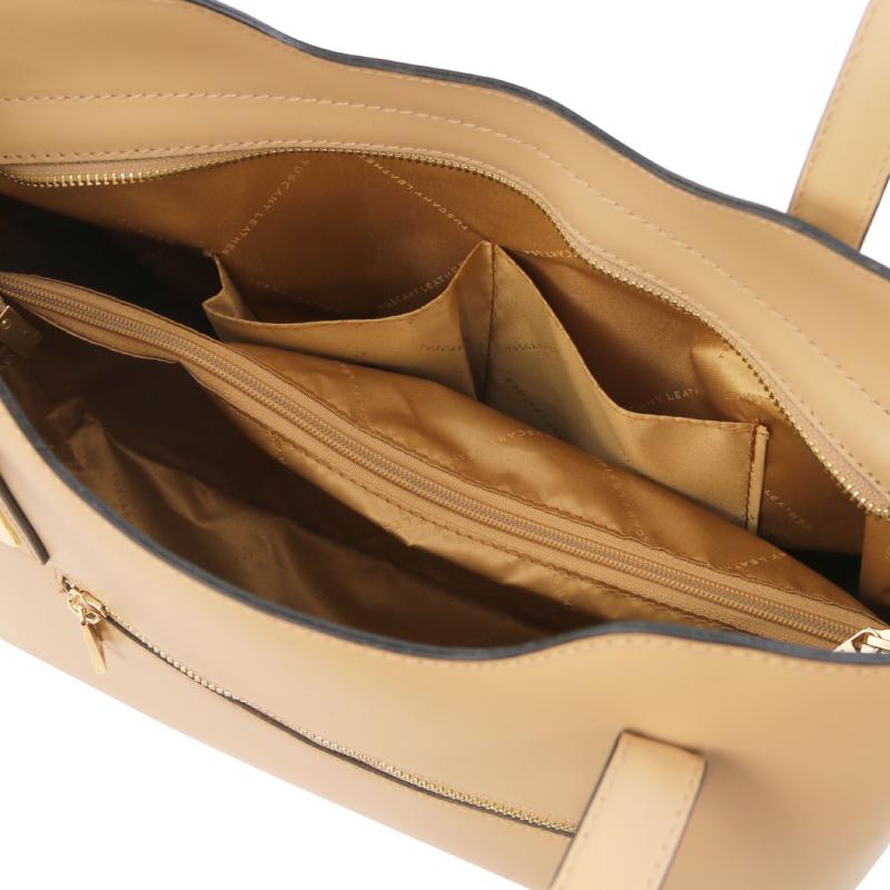Η Olimpia είναι μια γυναικεία τσάντα μεσαίου μεγέθους, κατασκευασμένη από άριστης ποιότητας ιταλικό δέρμα, ενώ είναι άκαμπτης κατασκευής. Η πρόσβαση στο εσωτερικό της τσάντας γίνεται με φερμουάρ. Εκεί θα βρείτε δύο μεγάλα διαμερίσματα που χωράνε μέχρι και χαρτιά μεγέθους Α4. Αυτό της επιτρέπει να χρησιμοποιηθεί άνετα και σαν επαγγελματική. Στο κέντρο της, υπάρχει μια μεγάλη θήκη η οποία ανοίγει επίσης με φερμουάρ. Το πρώτο διαμέρισμα διαθέτει 2 πολυχρηστικές θήκες ανοιχτού τύπου ενώ στο δεύτερο διαμέρισμα υπάρχει μια τσέπη με φερμουάρ. Στο πίσω μέρος της τσάντας θα βρείτε μια ακόμα τσέπη ανοιγόμενη με φερμουάρ.