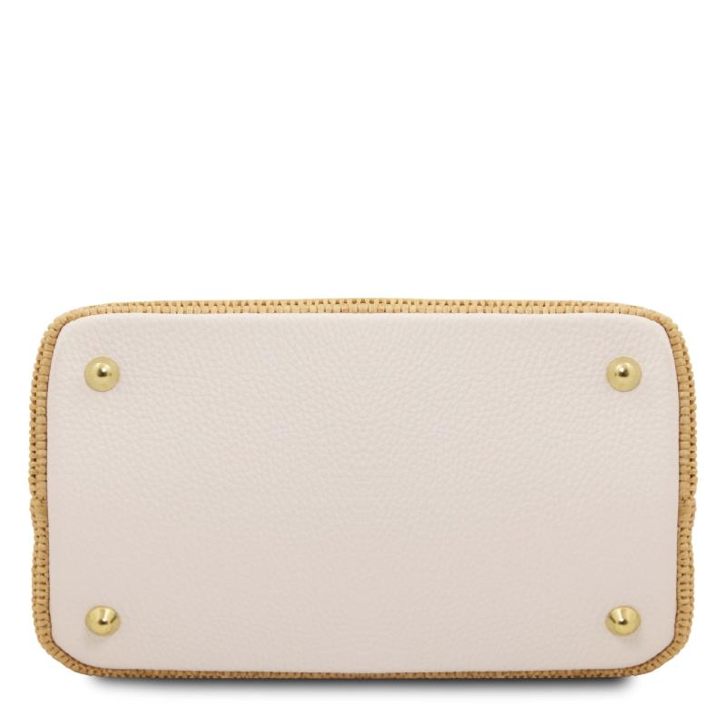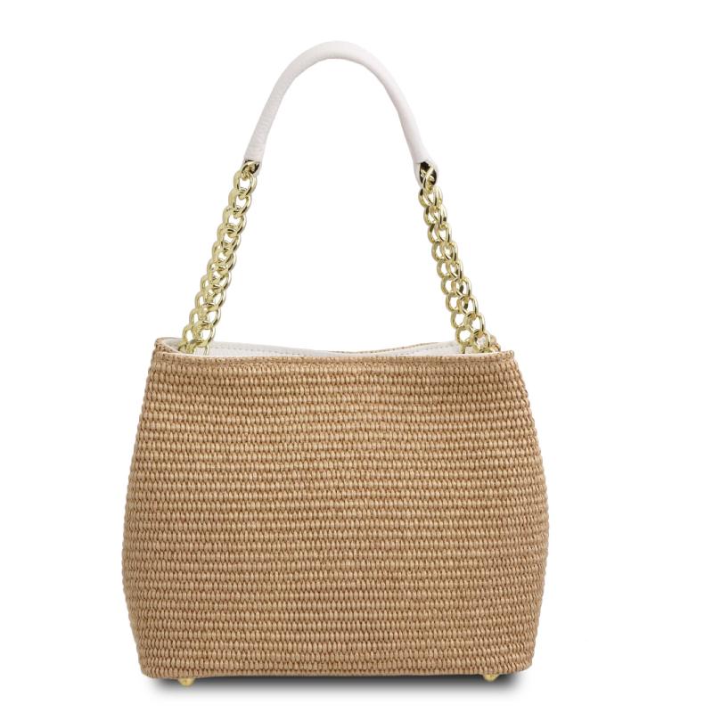 Είναι μια τσάντα μεσαίου μεγέθους, εύκαμπτης κατασκευής. To πάντρεμα του pebbled δέρματος με raffia εφέ και όψη ψάθας την κάνουν μοναδική. Η πρόσβαση στο εσωτερικό της γίνεται με φερμουάρ. Στο εσωτερικό της υπάρχουν δύο θήκες ανοιχτού τύπου και δύο ακόμα μεγαλύτερες τσέπες με φερμουάρ.