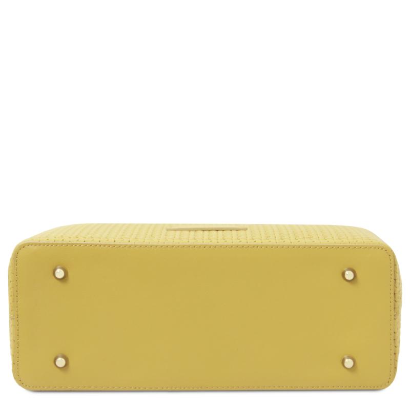 Κατασκευασμένη από υψηλής ποιότητας γνήσιο ιταλικό δέρμα με woven (πλεκτή) υφή, ξεχωρίζει για το ιδιαίτερο design της. Το ευρύχωρο εσωτερικό της διαθέτει μία κύρια θήκη, καθώς και εσωτερικές τσέπες για καλύτερη οργάνωση των προσωπικών αντικειμένων, συμπεριλαμβανομένης τσέπης με φερμουάρ και βοηθητικών θηκών για μικροαντικείμενα.