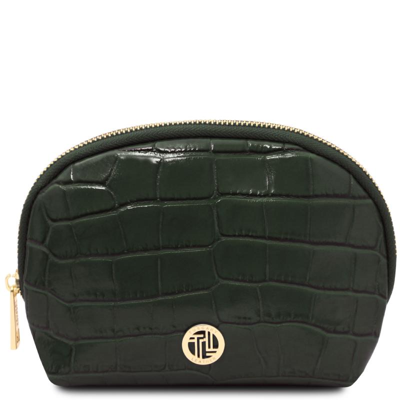 Κατασκευασμένο από ιταλικό δέρμα embossed, με τύπωμα croc ανοίγει με φερμουάρ και όλο το εσωτερικό του είναι επενδεδυμένο με φόδρα με το τύπωμα της εταιρείας. Οι μεταλλικές του λεπτομέρειες είναι στο χρώμα του χρυσού και συνοδεύεται από βαμβακερή θήκη φύλαξης.