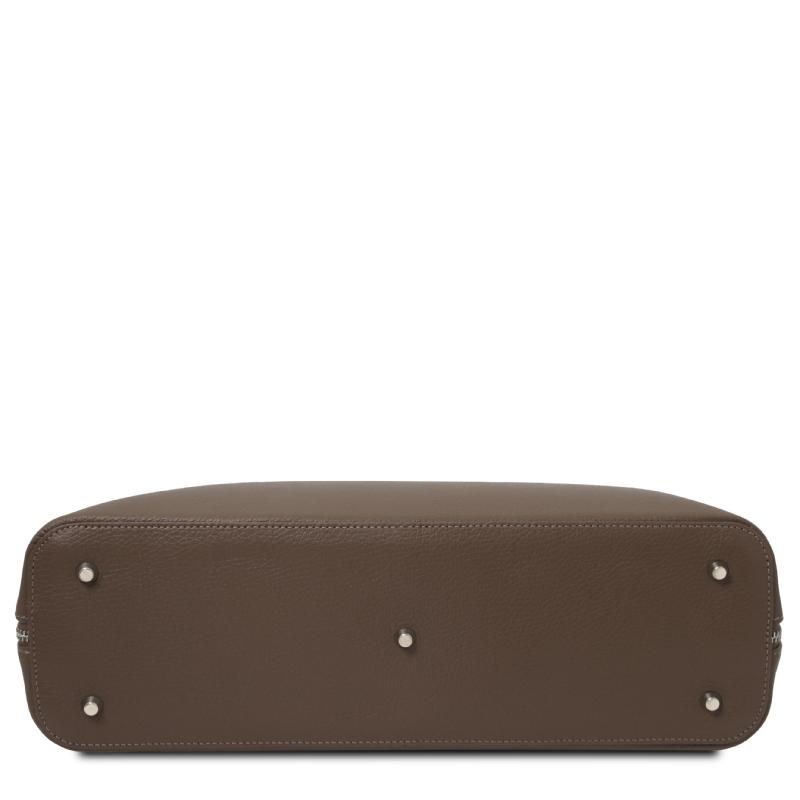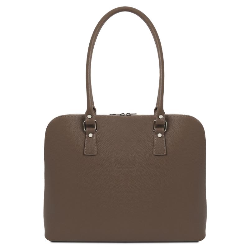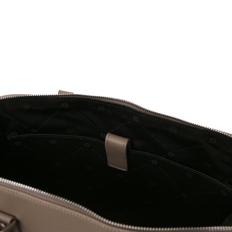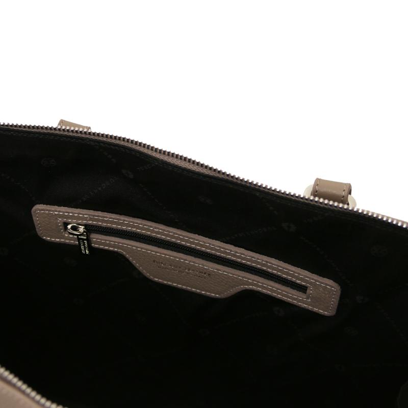 Κατασκευασμένη από εξαιρετικής ποιότητας ιταλικό Pebbled δέρμα, η τσάντα έχει ημιάκαμπτη δομή που της προσφέρει στιβαρότητα και κομψότητα. Η πρόσβαση στο εσωτερικό γίνεται μέσω διπλού φερμουάρ, προσφέροντας ευκολία και ασφάλεια. Το εσωτερικό της είναι λειτουργικό και ευρύχωρο, με δύο διαμερίσματα, το ένα εκ των οποίων περιλαμβάνει τσέπη με φερμουάρ για επιπλέον οργάνωση. Η τσάντα μπορεί να φιλοξενήσει χαρτιά Α4, και έχει εσωτερικές διαστάσεις 38 x 31 x 12 cm.
